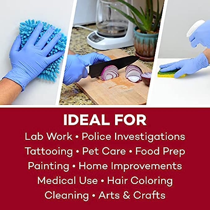 • MULTI-PURPOSE GLOVES – Bulk nitrile gloves are ideal for all-purpose medical use, police investigations, lab work, hair coloring, tattooing, food prep, painting, cleaning, pet care, home improvements, hobbies, and arts & crafts.