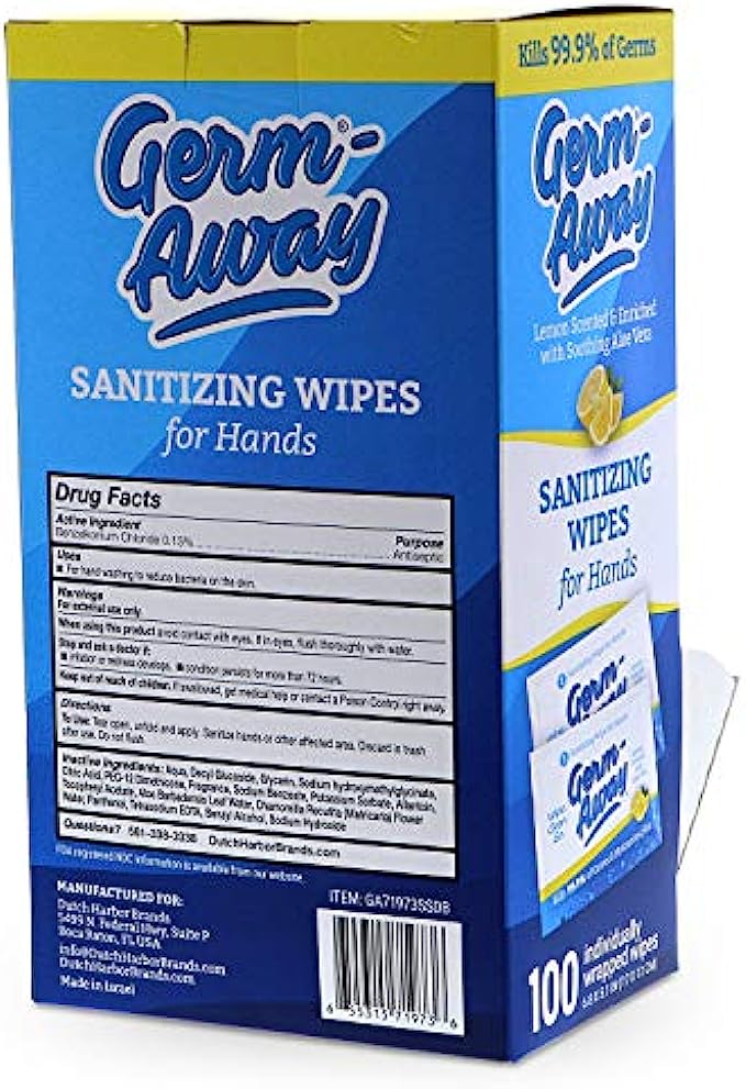 Germ-Away Large Antibacterial Hand Wipes Individually Wrapped Wipes, Travel Size Hand Sanitzer Wipes with Aloe in Dispenser Box, 100 ct Lemon Scent
