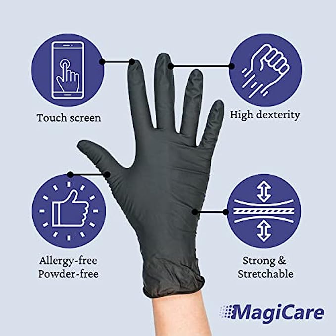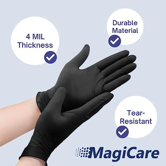 • ?DURABLE MATERIAL: MagiCare's tear-resistant Black Gloves are made from a strong, highly stretchable nitrile material - the best option for tear and puncture resistance.