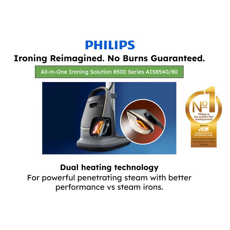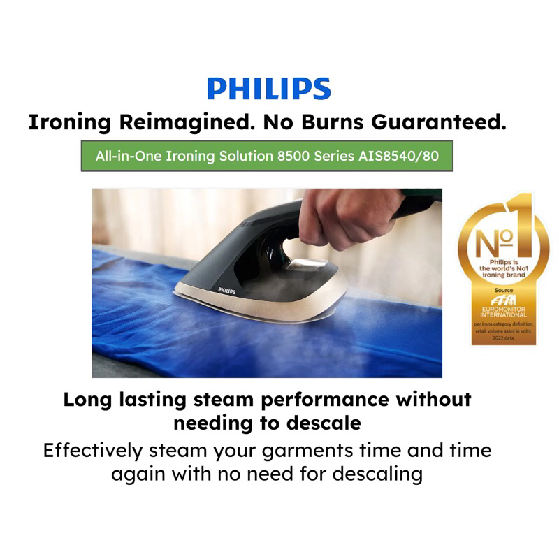 PHILIPS PREMIUM All-in-One Ironing Solution 8500 Series Stand Steamer AIS8540/80, 2200W, No Burns Guaranteed, Iron Head