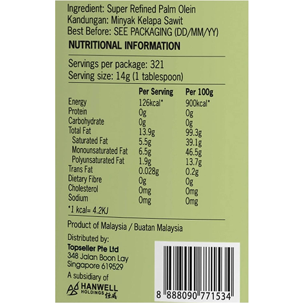 Quality:Good quality cooking oil Taste:Good Very good quality cooking oil.Third time order from this seller.Fast delivery and product as advertised.Very reasonable price will order again. Thanks seller.