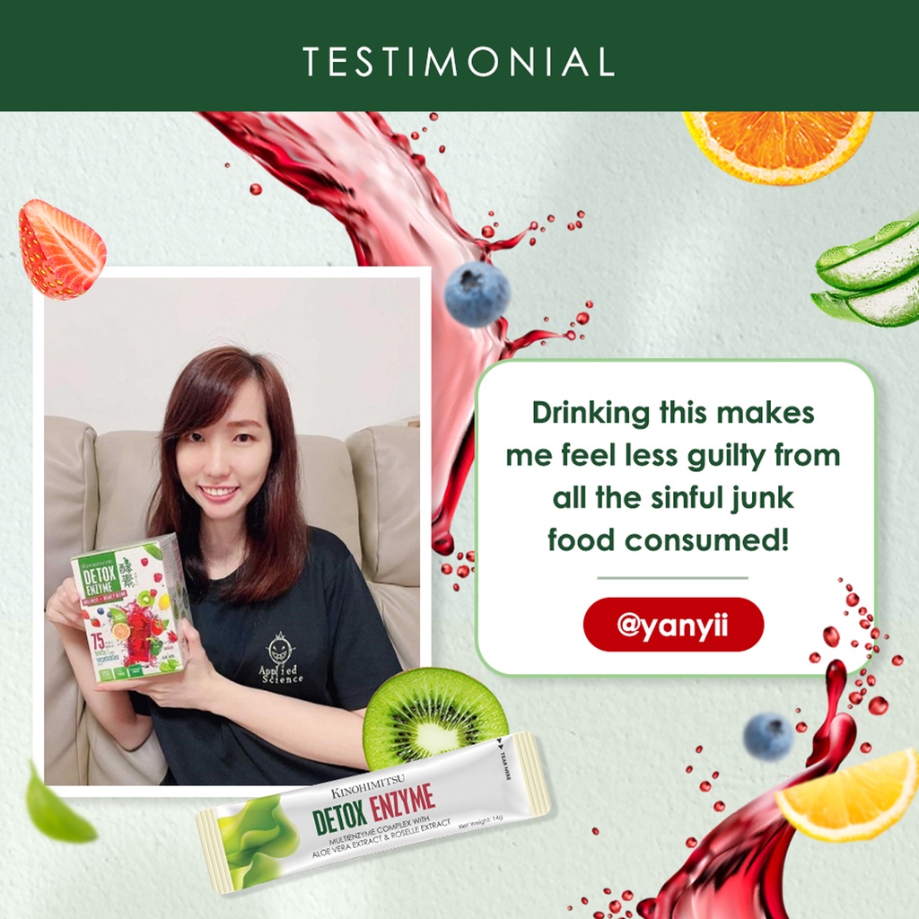 My stomach always feel hard to digest, bloated, plus long term constipation. Recently thanks to shopee farm I got a kinohimtsu voucher so bought the detox enzyme 3 sachets a pack to test try. After consumed 1 sachet, around 2 hrs later I did my business fast and smoothly in toilet (that day only went once). I can felt the inner of my big hard stomach became softer. After having my meal it became a bit harden back. Of course I knew still need to eat moderate, correct foods, plus one week at least 2.5 hours of exercise to loss weight and maintain it. Detox enzyme is just a supplement help me to relieve and aid in loss weight faster a bit than normal. Drink tasted like berry, nice. Promotion comes with a free small box of 5Dtox which inside got 8 sachets. Also taste like berry.